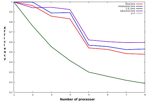 Les tests effectués pour réaliser ces courbes ont été effectués sur des machines possédant 4 processeurs ce qui explique la décroissance entre 4 et 5 processeurs. Cependant, on constate que le speed-up approche globalement la courbe idéale. Le parallélisme mis en place est donc très efficace pour des petite machines de calculs comme souhaité dans le cahier des charges.