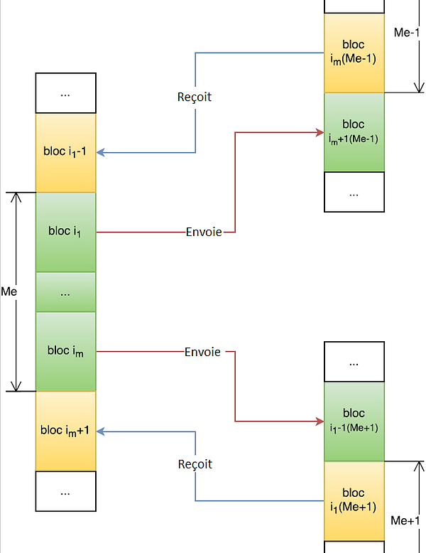Chaque processus disposant d'un nombre d'étages qui lui est attribué, il ne connait que les blocs numéroté de i_1 à i_m selon l'axe z. Les matrices des problèmes que nous cherchons à résoudre étant creuses il est obligatoire ici de transmettre certaines lignes du vecteur X à d'autres processus. En réalité, seuls les blocs juxtaposés à la diagonale sont non nuls, par conséquent le processus "me" a besoin de connaître les blocs i_1 - 1 et i_m + 1 afin de pouvoir calculer le produit matrice vecteur associé aux différentes résolutions. Ces communications sont résumées par le schéma ci-dessous :